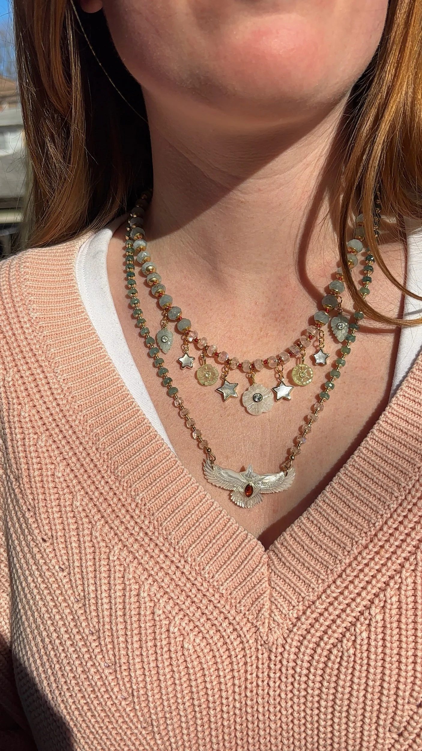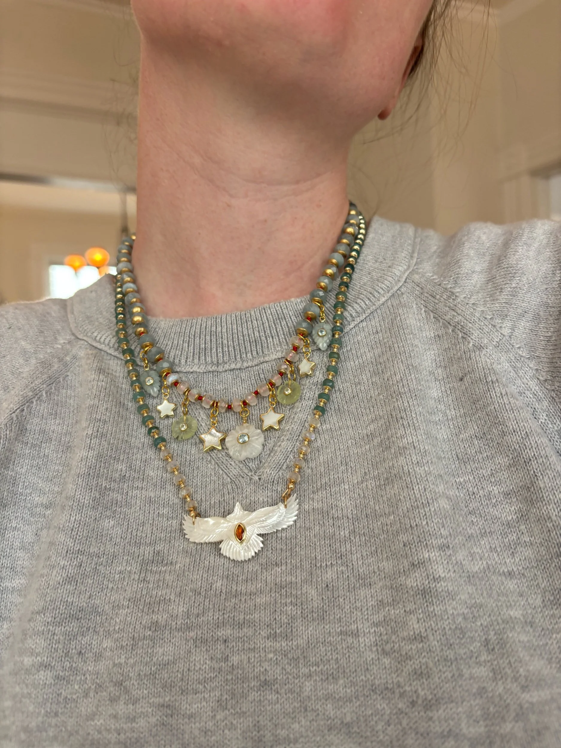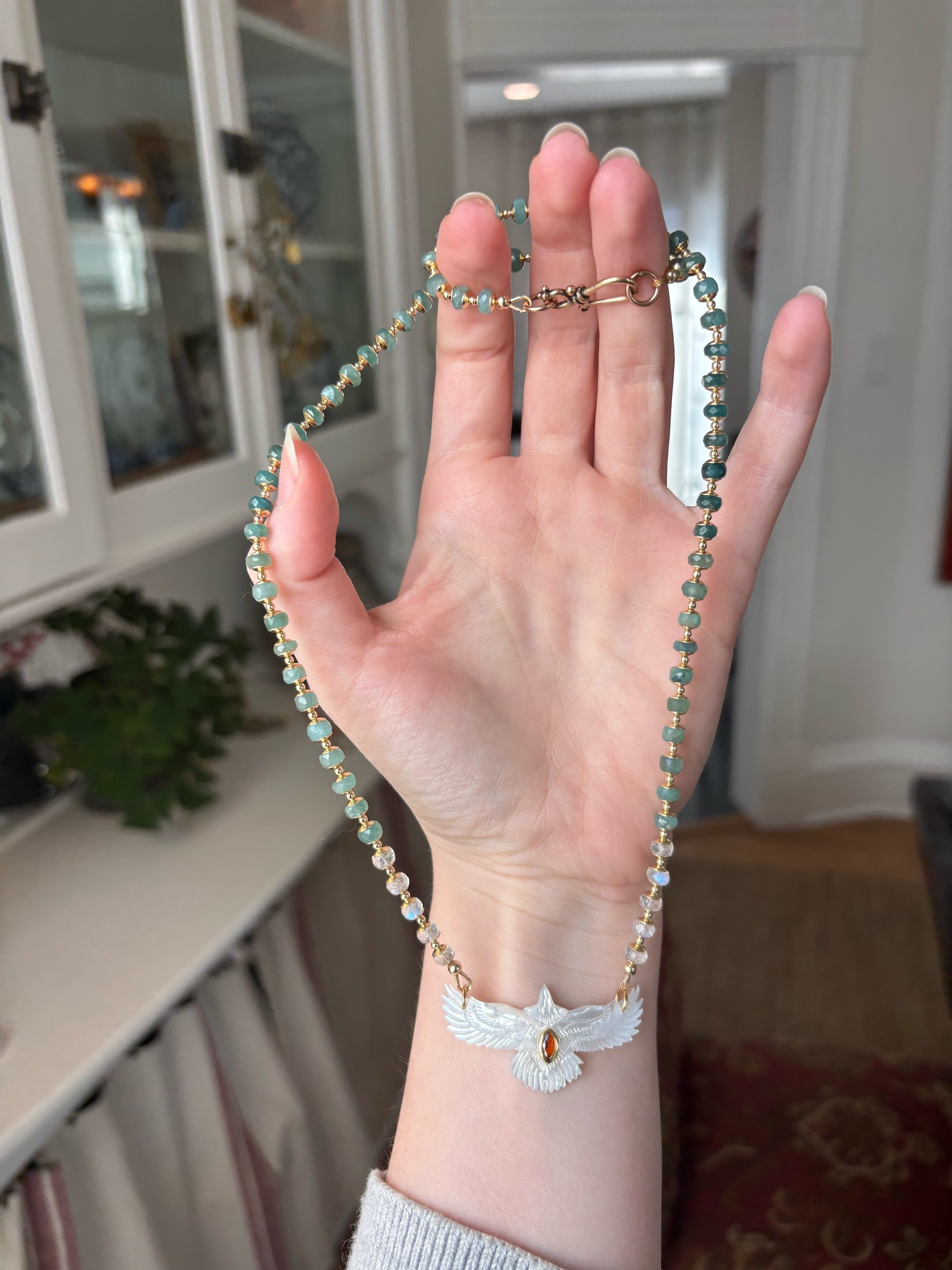 Skyward brings together rare grandidierite in deep ocean tones and flashes of rainbow moonstone with a hand-carved mother of pearl bird, centered by a warm carnelian stone. Finished with gold filled details, it carries a sense of upward growth, protection, and quiet elevation.